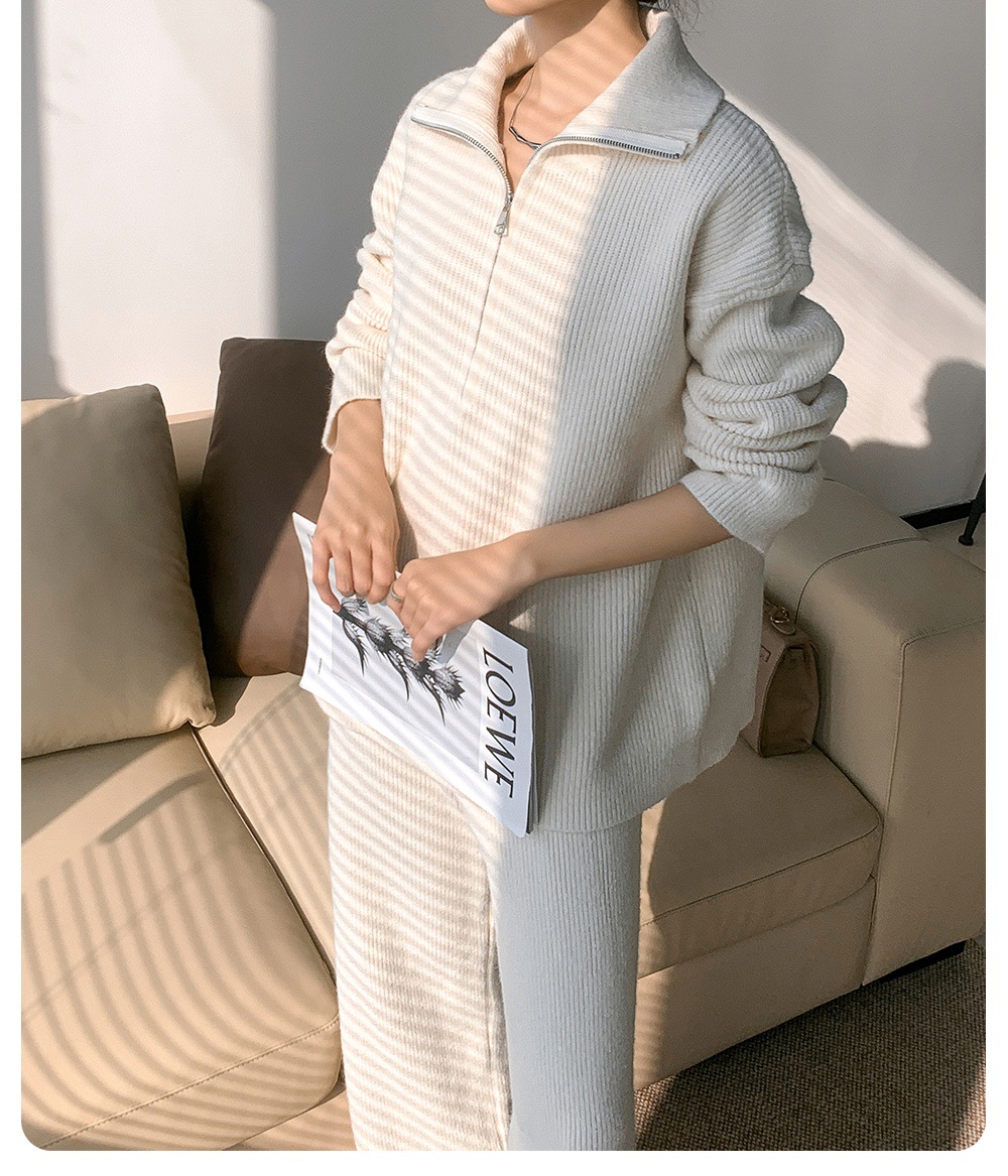Home Knitted Suit Gao Ning Zipper Block Sweater Set Women’s Autumn and Winter Loose Pure Collective Woven -leg Pants Two -piece Set